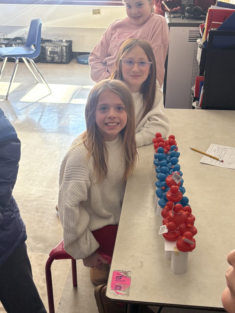 Students worked in groups of six “engineers” to build a bridge strong enough to hold as many rubber ducks as possible. The challenge included carefully measuring the bridge, adding creative decorations, and testing their design to see if their theory would hold up. With limited supplies such as index cards, students had to think outside the box with their designs.